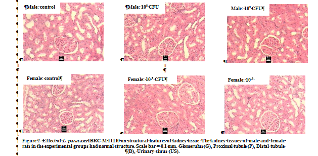 L. paracasei IBRC-M 11110 administration. This is in line with findings of a study on the effects of daily probiotics consumption on urea of chronic kidney patients (31). On the other hand, the high level of creatinine in this study may indicate kidney damage. However, creatinine was in the reference range, so the potential risk of kidney damage induced by the bacterium is minimal. Moreover, analysis of the liver and kidney tissue sections showed no abnormal pathological change. The findings support the results of serum analysis for lack of organ-related toxicity following the