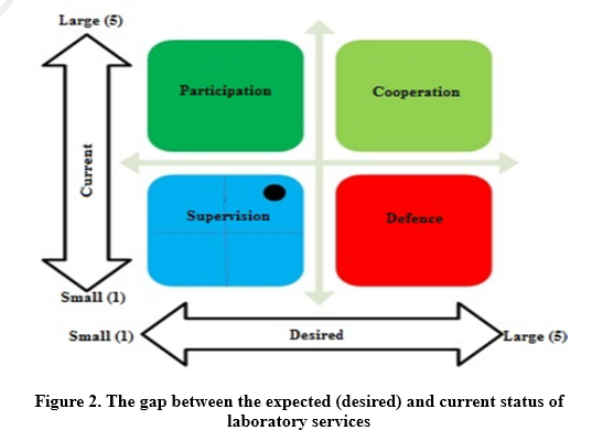 According to the results of (Table 2) and the examination of the mean current and expected (desirable) status of improving the quality of visit services in laboratories of medical-teaching centers, the gap was equal to -0.01. The gap between the current and expected status was small in the statistical population. According to the total mean of current and expected status, the intersection of the two points on the gap matrix indicated a small gap in the supervision phase (Figure 2).