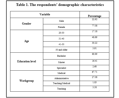The results of Table 1 indicated among 384 statistical samples, 22.92% were male and 77.08% were female. The largest age group was in the group of 31-40 years with 48.69% and most respondents had bachelor's education levels with a mean of 80.99%, and 67.71% were working in the medical field, 27.08% in the administrative field, 1.83% in the medical-teaching field, and 3.38% in the teaching field.